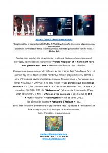 la chaine créée par la chanteuse et réalisatrice pour une éducation à la Paix, avec la présentation de ses programmes et extraits de ses séries et films essentiels multi diffusés sur Vià Grand Paris (Télif) et Demain TV, la diffusion de clips ou extraits de ses nouveaux CD/DVD et livres et la remise des Trophées de la Paix 2025 à de nombreuses personnalités