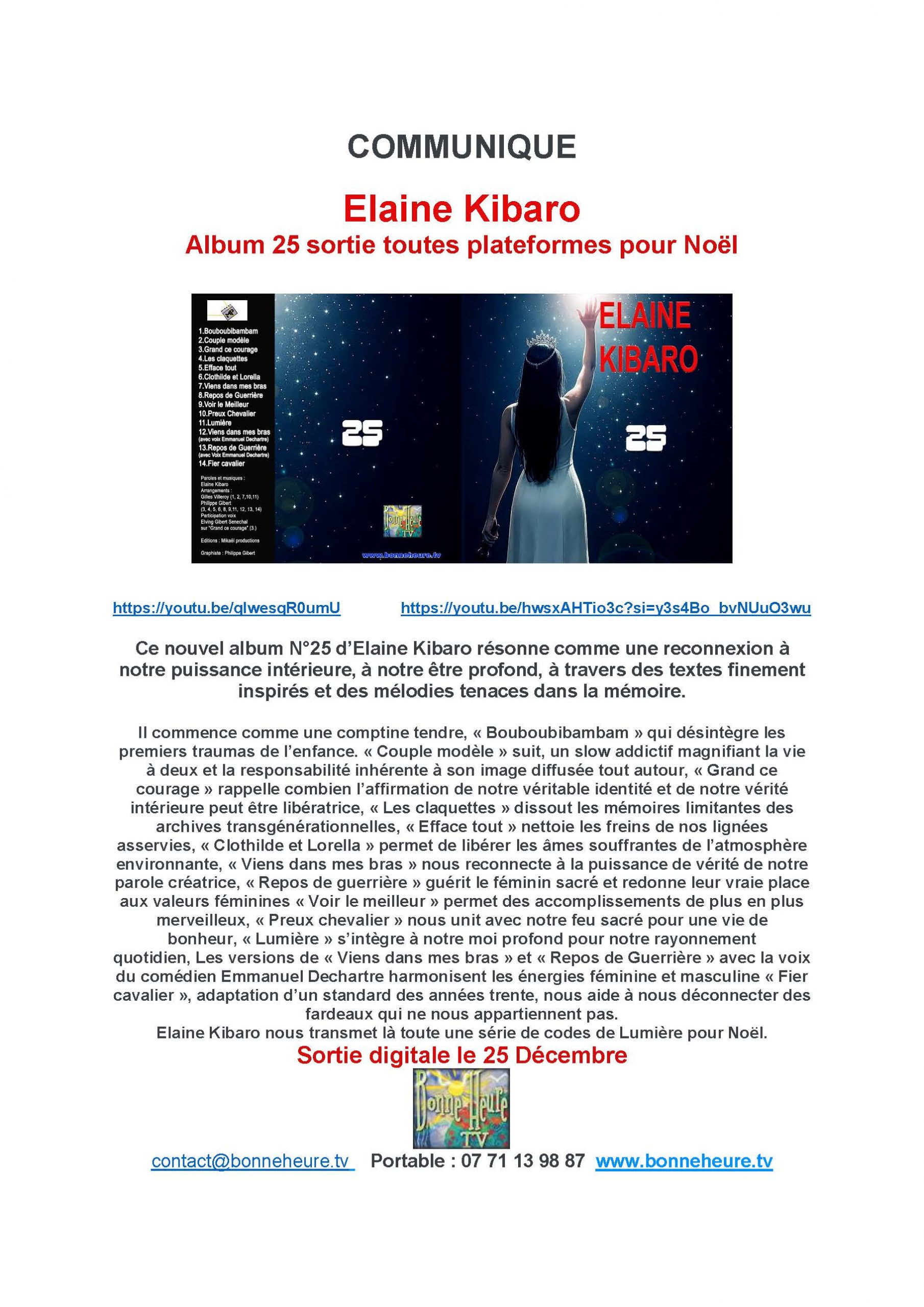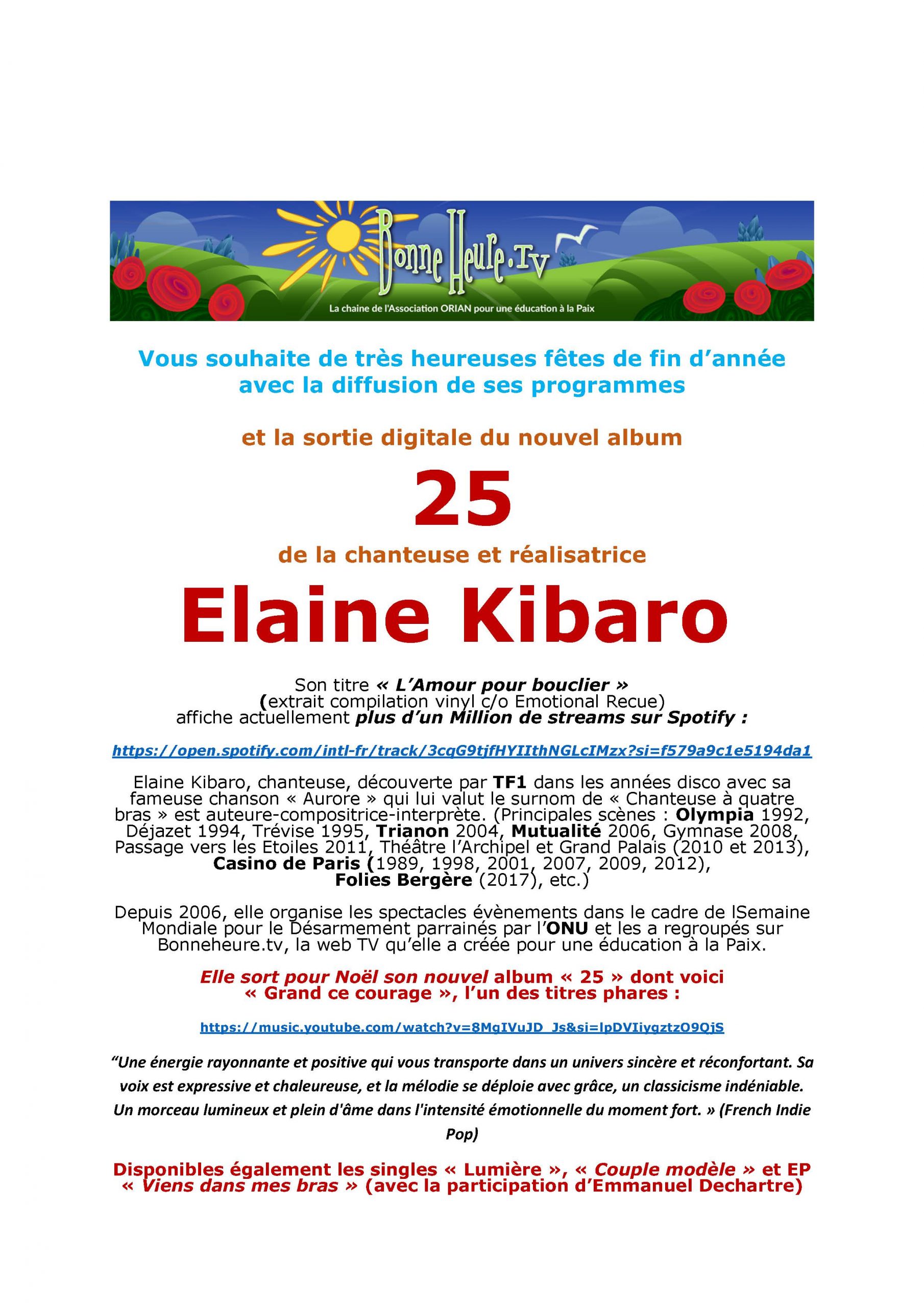 Elaine Kibaro a créé l’Association Orian pour une éducation à la Paix dès le plus jeune âge et a organisé des séries de représentations destinées au jeune public depuis 1994, puis a commencé à aller dans les écoles diffuser ses DVD/CD de contes musicaux « Les Contes de la Licorne », « Dans la Forêt », « Tata Noël » aux enfants qui n’ont jamais accès aux spectacles afin d’engager un dialogue avec eux. Le film qu’elle a réalisé pour tous les publics en 2010 « Ces phrases qui ont changé ma vie » en est un des aspects.